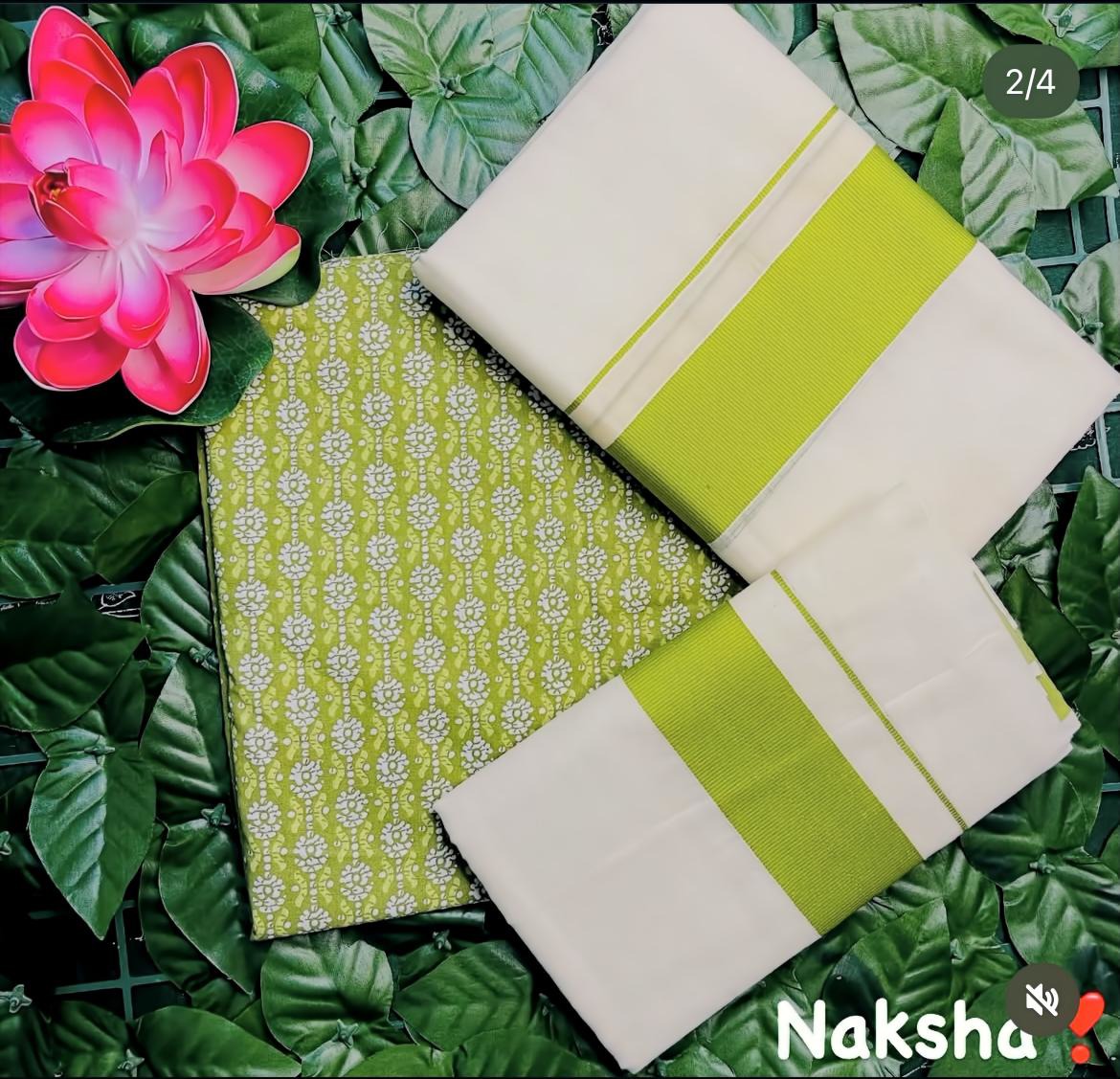 The Green Kattikara Setmund features a vibrant green fabric paired with a printed blouse piece, showcasing traditional design elements with expert craftsmanship. This set offers a perfect balance of style and comfort, making it suitable for special occasions and cultural events where elegance is paramount.