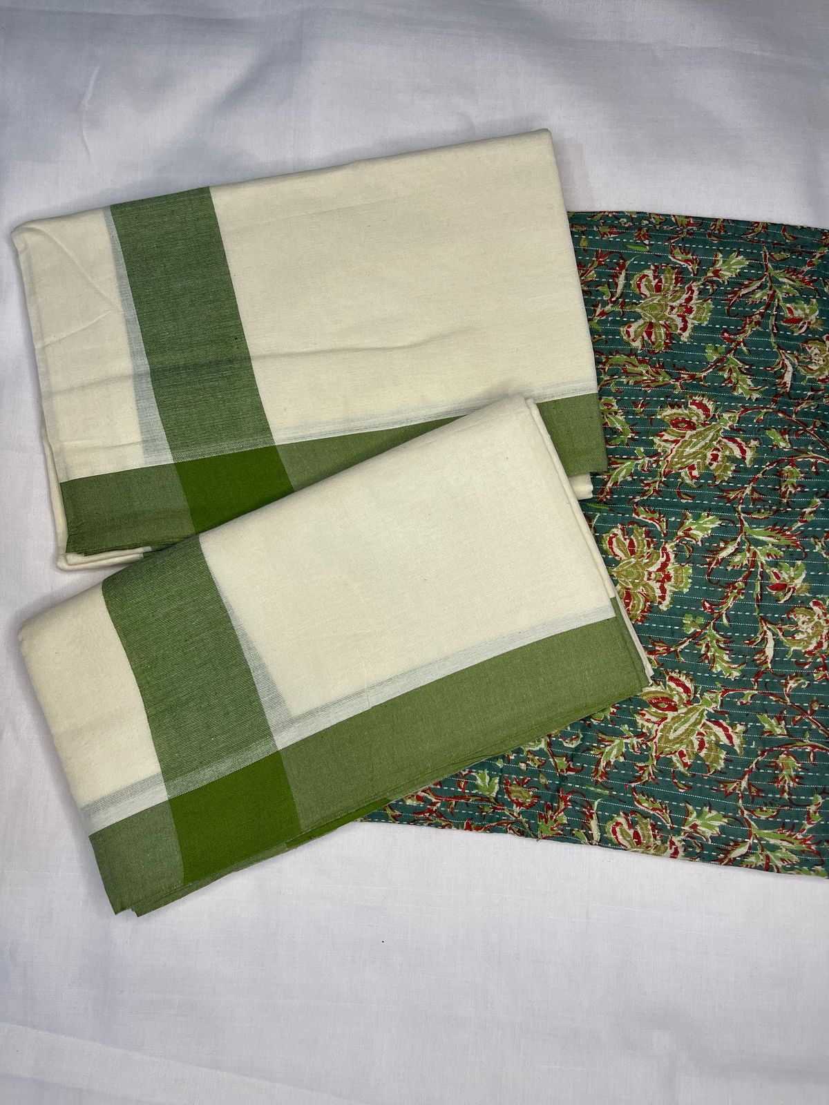 Subtle yet stunning .Our mulloth plain kara setmund with a floral cotton blouse brings a perfect balance of simplicity and charm.